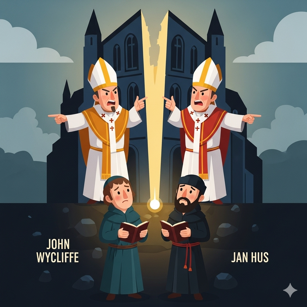 이렇게 교회가 흔들릴 때, 위클리프와 얀 후스 같은 용감한 아저씨들이 미리 나타나서 큰 소리로 외쳤어요. 그들의 목소리는 씨앗이 되어 사람들의 마음속에 심어졌죠. 비록 이 아저씨들은 바로 교회를 바꾸지는 못했지만, 이들의 용기가 있었기 때문에 나중에 마르틴 루터라는 사람이 나타나 교회를 완전히 새롭게 바꿀 수 있었답니다. 이 이야기들은 나중에 일어날 **'종교개혁'**이라는 아주 큰 이야기의 예고편이었어요!