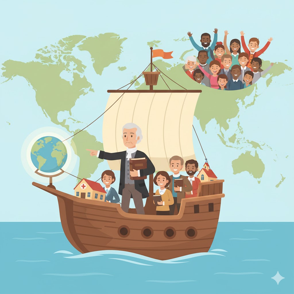 캐리 아저씨의 용기를 보고, 많은 나라에서 **'선교회'**라는 팀이 만들어졌어요. 이 팀들은 돈을 모아서 새로운 땅으로 떠날 용감한 선교사들을 도왔죠. 선교사들은 배를 타고 아주 멀리 있는 아프리카, 아시아, 태평양의 작은 섬들까지 갔어요.